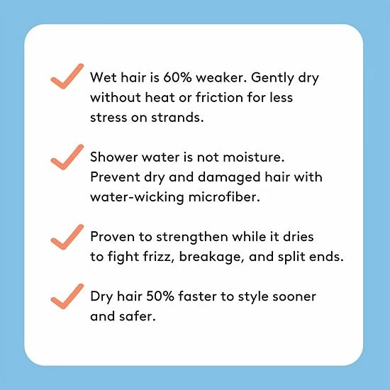 - Fabric gently wicks water away without frizz, tangles, and breakage from blow-dryers and traditional towels