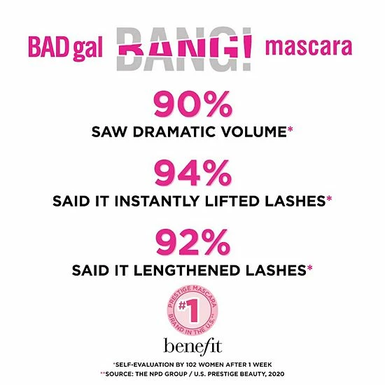 What Else You Need to Know: BADgal BANG! creates massive volume. The gravity-defying formula builds volume the more you layer, and contains aero-particles, one of the lightest materials from space technology. Its custom Big Slimpact! Brush is designed to reach every lash for big volume with 360-degree reach.