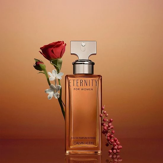 Fragrance Description: Calvin Klein ETERNITY Eau de Parfum Intense for Her is a vegan fragrance that incorporates upcycled ingredients of Turkish Rose Ultimate and sustainably sourced Jasmine Absolute Sambac. Housed in the iconic CK ETERNITY bottle, updated in a feminine shade of nude rose, this intense spicy scent evokes the most profound connection of passionate lovers.