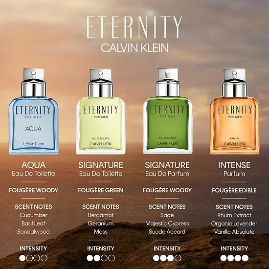 Fragrance Description: This vegan perfume fragrance incorporates upcycled cedarwood oil, responsibly and sustainably sourced ingredients, and is 71% biodegradable. Housed in a new cognac glass bottle, the luxurious spicy scent pays homage to the ETERNITY family and the rich passion of intimate lovers.