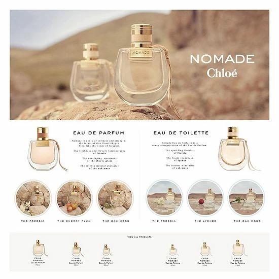 Fragrance Description: Nomade Eau de Toilette embodies freedom-loving women. A joyful and open-minded face-to-face encounter conveyed by the captivating eyes of this woman personifies the intensity of the moment. A strong, nomadic identity, like the Chloe womanthe Eau is modern, sunny, and natural with timeless elegance.