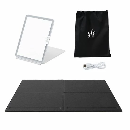 This travel-ready GloTech LED Mirror & Beauty Mat Set is a must have for your carry-on luggage.