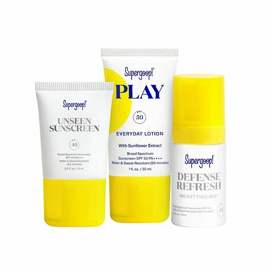 Unseen Sunscreen SPF 40 is an invisible and weightless sunscreen that leaves a velvety finish on the face. It can be used on its own or as a makeup-gripping primer under foundation. PLAY Everyday Lotion SPF 50 is a fast-absorbing sunscreen for face and body that is water- and sweat-resistant for up to 80 minutes. Defense Refresh SPF 40 is a makeup-setting spray with a light texture and gentle scent that make it easy to reapply SPF throughout the day.