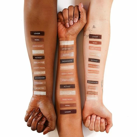 – 12 x 0.053 oz/ 1.50 g Eyeshadow in Charmer (off white), Jetsetter (warm taupe), Rocker (shimmering taupe), Smokeshow (black brown), Flower Child (peachy nude), Smarty Pants (tan), Firecracker (bronze copper), Activist (dark brown), Funny Girl (champagne), Sweetheart (peach), Rebel (chestnut brown), Leader (aubergine)