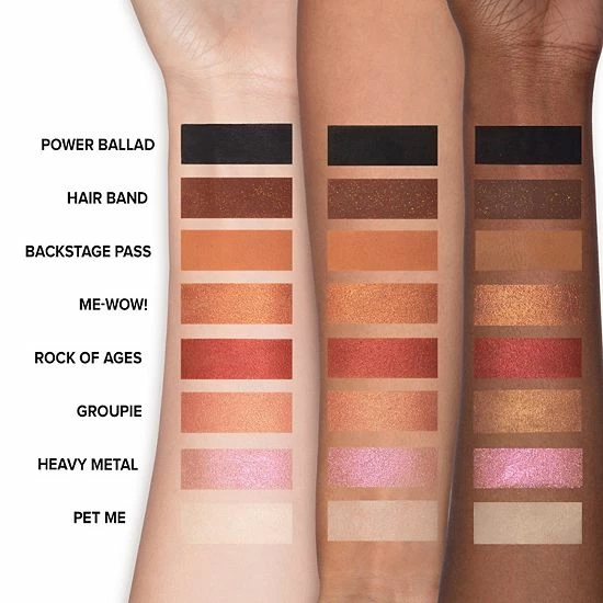 – 6 x 0.02 oz/ 0.8 g shadows in Heavy Metal (shifting pink-gold shimmer), Groupie (peachy-rose metallic), Rock of Ages (rusty-red metallic), Backstage Pass (light-brown matte), Hair Band (brown matte w/ gold sparkles), Power Ballad (deep-black matte)