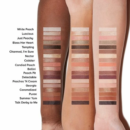 – 18 x 0.03 oz in White Peach (matte vanilla cream), Luscious (pearl peach champagne), Just Peachy (shimmering peachy pink), Bless Her Heart (golden moss), Tempting (bronzed black), Charmed, I’m Sure (matte medium cool brown), Nectar (pearly peachy cream), Cobbler (peachy pinked bronze), Candied Peach (matte coral with violet shimmer), Bellini (gilded peach), Peach Pit (satin perfect rasin), Delectable (matte smoky amethyst), Peaches ‘n Cream (matte milky peach), Georgia (matte peachy pink), Carmelized (dark gilded bronze), Puree (metallic dark bronze), Summer Yum (matte gingerbread), Talk Derby To Me (shimmering black violet)