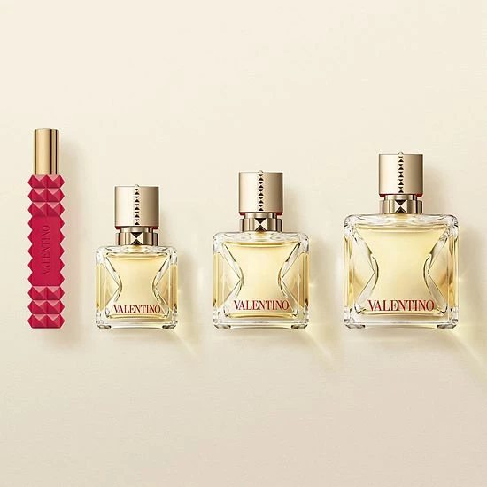 About the Bottle: A sleek glass bottle, square and notched on the sides, reveals the light passing through the encapsulated womens fragrance, allowing a V of light to emerge. The iconic Valentino rock stud details the chrome cap and collar alongside a vibrant red that contrasts the floral womens perfume within.